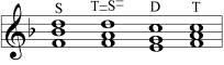It is useful for the harmonic analysis of the dissonances to mark the root tone, third, and fifth as lines behind the abbreviations of the tonic, dominant, and subdominant. The lines symbolise the position of the tones in the basic form of the triad: In this harmonic formula, the root tone is marked at the bottom, the fifth at the top. Example: A combination of the root tones of the dominant and subdominant: